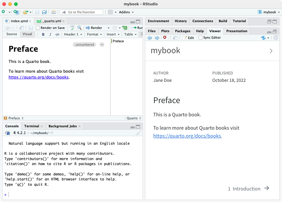 Above we demonstrated how to create and edit a simple book with chapters contained in the files index.qmd
