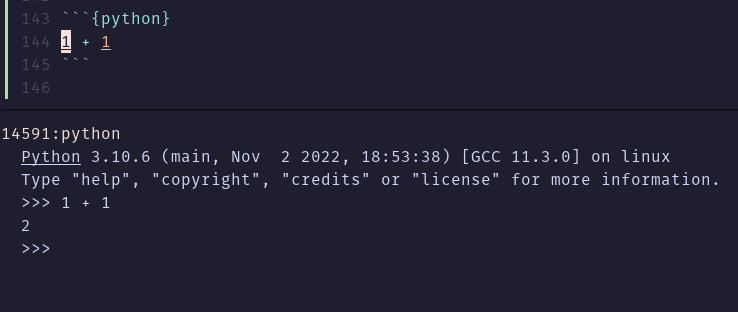 You don’t need to fully render documents in order to iterate on code cells. With the provided configuration we can open a terminal of our choosing using the leader key (<space>) followed byc (for code) and then p (for python) or i (for ipython).